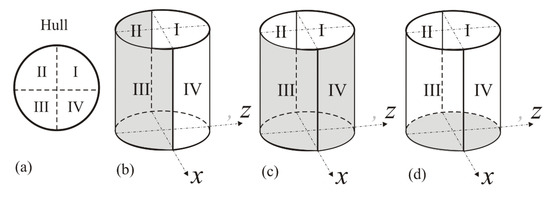 Figure 6 depicts a scheme of application of reaction forces in a distributed way in the brackets. Figure 6a shows a numbering of quadrants of the hole and Figure 6b–d illustrate the hole’s internal regions that receive the loads acting on the brackets in the three different axes, x, y, and z, respectively.