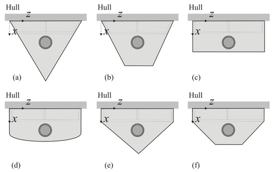 For the geometrical investigation, it is considered that the area of the basis plate is constant for six different geometric configurations: (1) triangular, (2) trapezoidal, (3) rectangular, (4) rectangular/elliptical, (5) rectangular/triangular, and (6) rectangular/trapezoidal. The plate basis sketch can be viewed in Figure 7a–f. All the configurations have the same area constraint, which agrees with the Constructal Design method [20,21,22,23,24,25]. The performance indicator here is the minimization of the maximum von Mises stress. In the present work, we did not explore the variation in geometric variables for each design. The purpose here is to show that the geometrical configuration can be an important subject in designing this kind of structural component used in mooring systems, a sort of proof of concept.