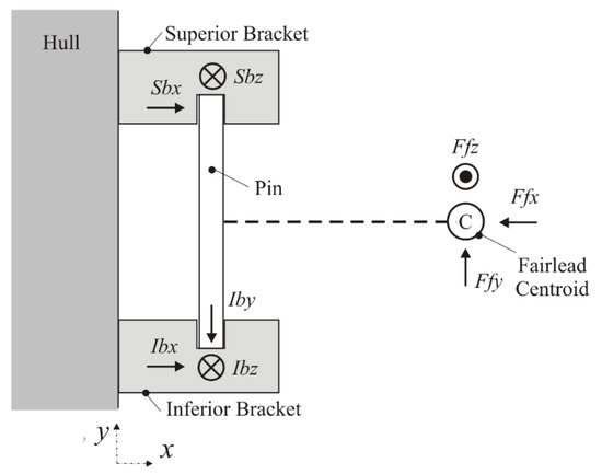 After calculating the loads on the centroid of the fairlead, it is possible to consrtuct a free-body diagram in the set fairlead/bracket to estimate the reaction forces acting on the brackets. Figure 8 illustrates a lateral view of the brackets and the pin that connects them to the fairlead. Table 4 presents the reaction forces calculated in the brackets under two ULS and ALS conditions. It is possible to observe that the inferior bracket is subject to higher force magnitudes than the superior bracket, mainly because it absorbs the loads in the y-axis, which does not happen with the superior bracket. As expected, the ALS condition’s reaction forces are higher than those found for the ULS condition.