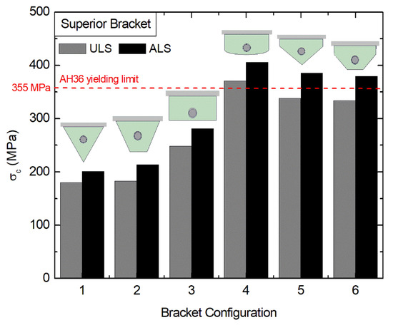 Maximum von Mises stress obtained in the superior bracket for the six different geometric configurations under the ULS and ALS conditions.
