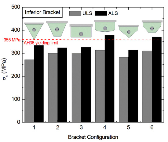 In contrast, the rectangular/triangular and rectangular/trapezoidal configurations have a poor performance, with the magnitudes of von Mises stresses almost achieving the yielding limit stress of the material. It is possible to notice that the performance is more homogeneous among the different configurations for the inferior bracket. Moreover, the magnitudes were higher those that reached for the superior bracket, with the best performance for ULS and ALS conditions being reached, respectively, for the triangular (with σc = 272.07 MPa) and the rectangular/triangular (with σc = 313.01 MPa) configurations. In general, the results demonstrated that the geometric design could be an essential aspect to improve the stress distribution in the bracket domain.