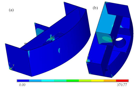 Distribution of the von Mises stress (in MPa) for the triangular shape of the superior bracket under ULS conditions: (a) superior view and (b) inferior view.
