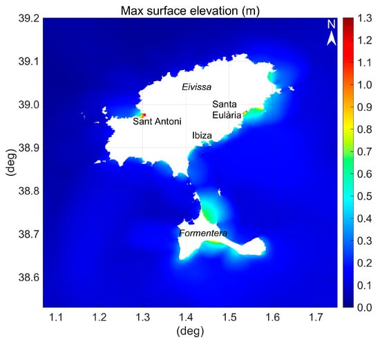 | B | Sant Antoni-Near the fishermen pier | +1.16 | −1.33 | 1.2 (1.4) | 150 | Flooding, 15 boats, port facilities |