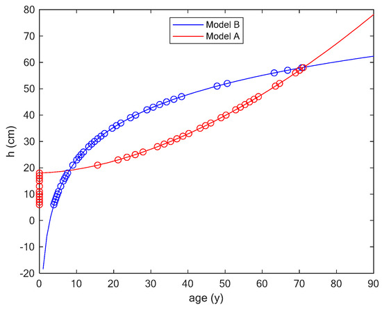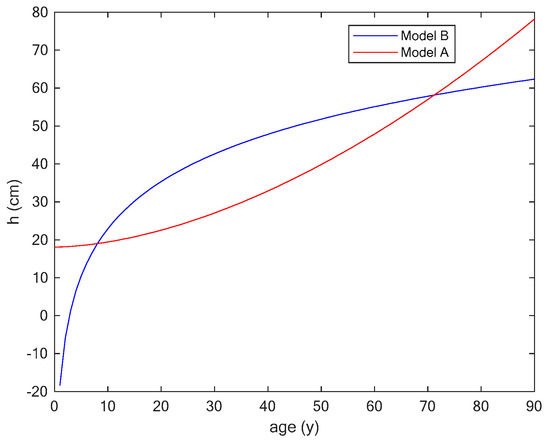 For both models, the behavior of height as a function of age was analyzed to compare the performance of the two models. In particular, the following relationship was obtained from the modeling proposed in [33]:
