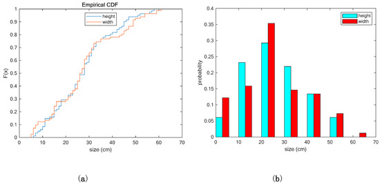 (a) Empirical distribution functions of height and width of the Eunicella verrucosa colonies off Sanremo; (b) Histogram of height and width for classes 10 cm wide.