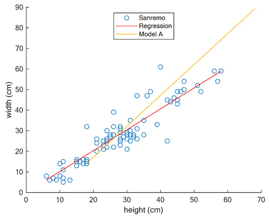 The relation between width and height for the population of Sanremo was analyzed by calculating the linear regression of width on height for two models, i.e., and . The standard error of regression coefficients, their 95% confidence intervals, and p-values were evaluated by means of a t-statistic. The linear regression was compared with a scatter plot for the population off Sanremo and with a regression illustrated in [33] relevant to model A.