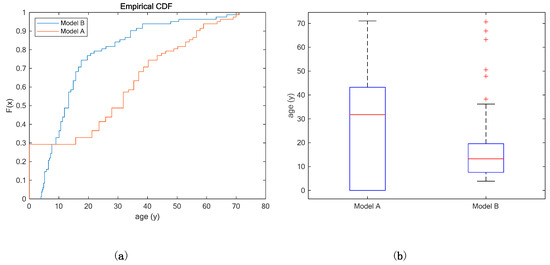 Age of the Eunicella verrucosa colonies off Sanremo estimated using model A and B. (a) Empirical distribution function; (b) Box plot showing median (red), first and third quartile (blue), range (whiskers), and outliers (red crosses). Here, outliers are values at a distance above the third quartile or below the first quartile greater than 1.5 times the interquartile range.