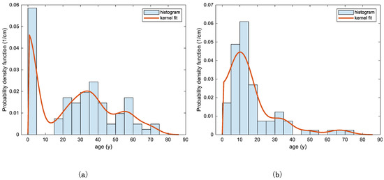 Age-frequency distribution of the Eunicella verrucosa population monitored off Sanremo, by model. (a) Model A; (b) Model B. The histograms have been normalized to become comparable with the estimated probability density function. The bin width of the histogram and the bandwidth of the Gaussian kernel are both set to 5 years.
