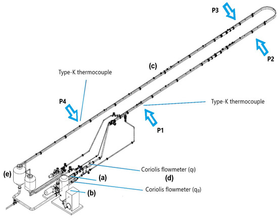 Diagram of the setup. The locations of the pressure transducers and the thermocouples are labeled as P1, P2, P3, and P4. The system’s main components are the progressive cavity pump (a), the air compressor (b), the test section (c), the flow control and Coriolis devices (d), and the separator tanks (e).
