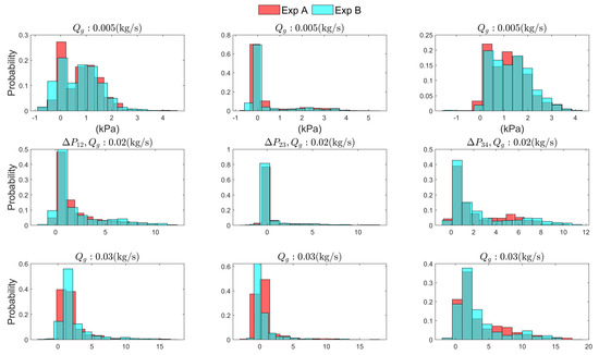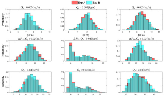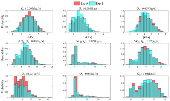 Histograms of for a liquid mass flow rate 1.3 kg/s with 0.005, 0.02, and 0.03 kg/s of gas mass flow rate. Data from two experiments are presented.