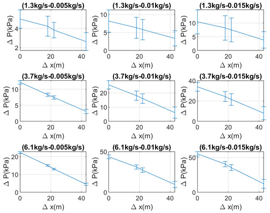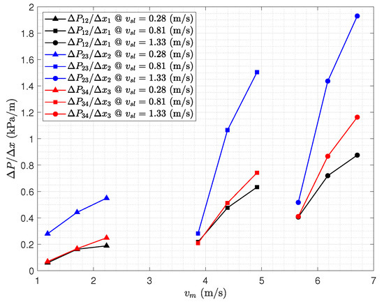 Generally speaking, the average pressure gradients are different in each of the three sections of the pipeline. Figure 7 illustrates this situation with plots for , and for all combinations of glycerin and air mas flows rates. The specific values summarized in Table 8 and Table 9 lead to the following observation: the greatest differences between pressure gradients are produced with the highest liquid and gas mass-flow rates.