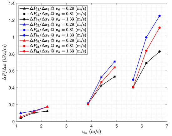 Figure 8 shows the average pressure gradients as a function of the mixture velocity, (where and are the superficial liquid and gas velocities). The gradients are similar for low values, but exhibit substantial differences at higher velocities. In the latter case, the average pressure values cease to represent good estimates because the elevated number of fluctuations produces a wider statistical dispersion. Therefore, a more meaningful measure of the pressure drop may be defined in terms of a root-mean-square (or RMS) value that takes into account the statistical dispersion. We accordingly use