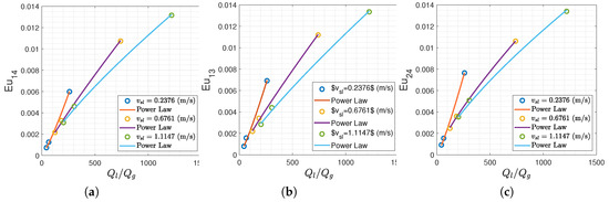 Note in Figure 10 (for neighboring measurement ports) and Figure 11 (for distant measurement ports) that the values of the scaled pressure drop (embodied in the Eu) are, roughly, in a linear proportion to the ratio . The slopes of the respective fitting curves decrease somewhat with , while being shifted towards higher values of Eu. This results from complete dominance of the liquid phase on the frictional losses, an effect that can only increase as the gas flow rate is reduced. Meanwhile, the relative reduction of the slope is explained by the corresponding increase of the hydrodynamic head at higher ratios.