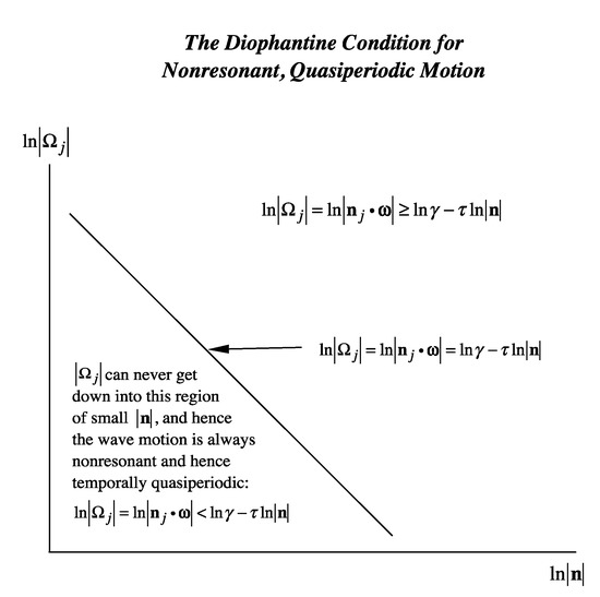 Generally, the wavenumbers, frequencies, and phases are all incommensurable (unequally spaced) and denumerable (vectors of length N, the so-called genus) in the solutions of nonlinear integrable wave equations. Of course, determination of the Fourier parameters for a particular Cauchy initial condition is key to the success of the method. To solve nonlinear integrable wave equations by a linear superposition of sine waves (A5) may seem like a miracle, if not impossible, but it is the consequence of the generality of the mathematics of quasiperiodic Fourier series and the integrability of certain nonlinear wave equations of interest for the study of water waves.