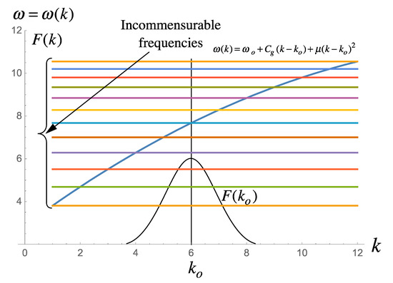 Here is the nonlinear dispersion relation. The wavenumbers are non-denumerable (there are infinitely many of them) and commensurable (equally spaced). The frequencies instead are also non-denumerable (there are infinitely many of them) and incommensurable (not equally spaced because of the form of the nonlinear dispersion relation for water waves).