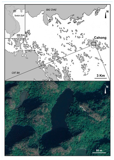 Cat Ba Archipelago—in Ha Long Bay (North-Eastern Vietnam)—is characterized by thousands of karst towers and islands dating back to the Tertiary Period (about 35 mya). Karst processes have induced the formation of numerous sea lakes [1]. Besides Vietnam, in the Indo-Pacific area, analogous marine lakes are found in Indonesia and Palau. Recent reports from Vermeulen et al. [2] registered 138 sea lakes in Ha Long Bay, which correspond to about 1/3 of the 400 estimated saltwater lakes existing all over the world.