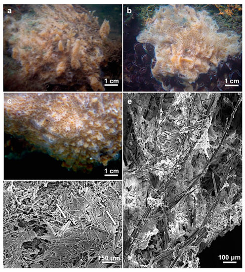 Spongilla manconiae sp. nov. (a) Holotype MSNG 61501; (b) Paratype MSNG 61502; (c) Topotype HL108; (d) Ectosomal skeleton with tangential spiny microxeas. Arrows indicate the spicules of the longitudinal primary fibers that protrude from the sponge surface; (e) Choanosomal skeletal architecture (transverse section).