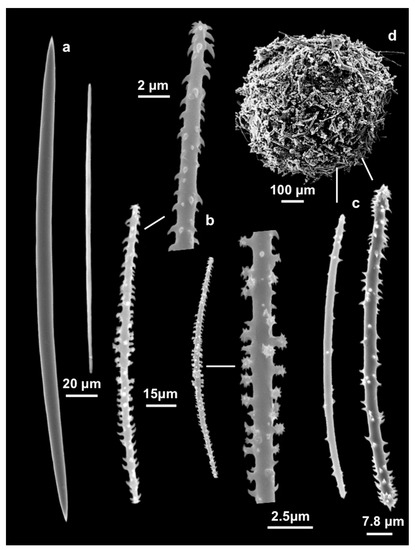 Spongilla manconiae sp. nov. SEM images of spicules. (a) Oxeas; (b) Microxeas, with magnification of the spines; (c) Gemmuloscleres; (d) Gemmule.