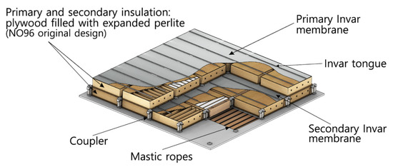 In the International Maritime Organization (IMO) classification, existing LNG carriers are classified as integrated or membrane-type (Mark-III and NO 96) and independent (Moss and SPB). Of these, membrane-type NO 96 LNG tanks (Figure 1) are most widely used because they are relatively inexpensive to produce []. The most important feature of this NO 96 type of tank is that both primary and secondary barriers use Invar sheets; the total weld length in the LNG carrier is about 250 km, of which 95% is welded automatically and 5% manually, and 90% of these automatic welds are resistance seam-welded (RSWed). In other words, the quality of the seam weld, which accounts for the bulk of the LNG carrier welds, has a great impact on the structural strength of the entire membrane. Nevertheless, while the reliability of the Invar base by fatigue property evaluation has been assessed by several researchers, tensile property evaluation of RSWed Invar welds itself has not yet been attempted because sampling of welds itself for tensile testing is not possible.