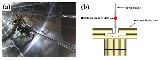 Resistance seam welding (RSW) of Invar membrane sheet at the tongue: (a) actual RSW in liquefied natural gas (LNG) cargo containment system construction; (b) schematic diagram of Invar membrane sheet joint.
