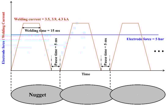 In this study, three Invar alloy sheets of thickness 0.7/0.5/0.7 mm were welded to form a lap joint. Two cylindrical electrodes were used of diameter 62 mm. The resistance seam welding parameters were a constant 5-bar electrode force, welding current of 3500A/3900A/4300A, a 15 ms electric current application time, and a 5 ms pause between alternating pulses []. Figure 3 shows schematic diagram of the resistance seam welding cycle.