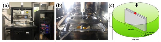 Low-temperature indentation system equipped with environment chamber: (a) photograph of the system; (b) the stage in the chamber; (c) sample mounted for low-temperature indentation test.