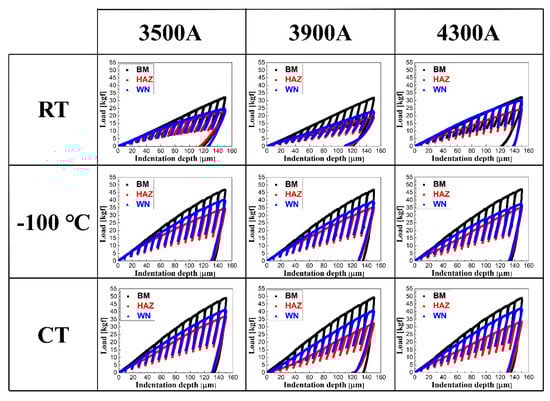 For IITs, the RSWed Invar alloy was cut and mounted and then mechanically polished using SiC paper up to grit number #2200 according to ISO14577-1 []. In total, nine mounting samples for three test temperatures (RT, −100 °C, −163 °C) and three weld currents (3500A, 3900A, 4300A) were prepared. Then, three repeatable instrumented indentation tests were performed for each region (BM, HAZ, WN) in one sample, using an AIS3000 (Frontics Inc., Korea), which has 0.1 µm displacement resolution and 0.002 kgf load resolution. The indenter is a 250 µm radius spherical type made of tungsten carbide. The indentation speed was 0.3 mm/min, and 15 multiple unloadings (up to 50% of maximum load) were performed in 150 µm depth control mode. As shown in Figure 4a, The low-temperature environment chamber was used for the low-temperature indentation test, and the target temperature was secured through cooling by liquid nitrogen and heating using a heating chuck beneath the stage in a vacuum atmosphere. At this time, thermal grease was applied to the mounted sample floor to increase heat conduction. The indentation load and depth curves of RSWed Invar alloy at different welding currents and temperatures are shown in Figure 5.