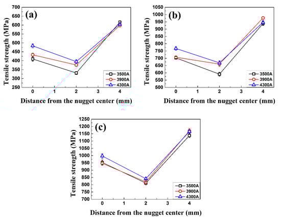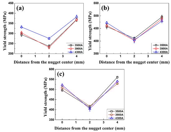 The microstructural changes with welding current in the same area can also be seen in Figure 10. As the current increases, the size of the WN increases and its grain size increases as well. Generally, since grain size and strength are known to be in inverse proportion (Hall–Petch equation) [], the strength would also be expected to decrease as the welding current increases, but Figure 7 and Figure 8 show that the actual strength increases with the welding current. This unexpected result is due to the change in the constraint effect in the WN, as described above. The WN formed in the 3500 A view is small and does not fully constrain the plastic zone produced by indentation, but the increases in weld current produce a larger WN and a greater constraint effect [].