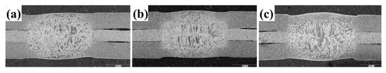 Macro-examination of RSWed Invar alloy at different welding currents: (a) 3500A; (b) 3900A; (c) 4300A.