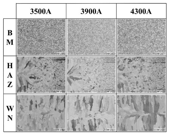 First of all, the distribution of microstructures over the zones shows that the average grain size is large (ordered BM < HAZ < WN (Figure 10)) because joule heating during welding depends on the distance from the WN. Grain growth was greatest in the WN, which received the heat input most directly; the less heated HAZ shows less growth, and the BM, heated least of all due to distance, maintains its original grain size. In addition, the HAZ and WN in Figure 10 show that the typical fan-like columnar structure develops radially [], regardless of welding current. This can be attributed to the radial spread of the heat flux in the Invar melted during welding. In other words, the direction of grain growth matches the temperature gradient [], and equiaxed grains develop near the BM where the heat flux is almost nonexistent. At this time, the BM is made up of fine austenite grains [] with an average crystal size of about 6 , independent of welding current.