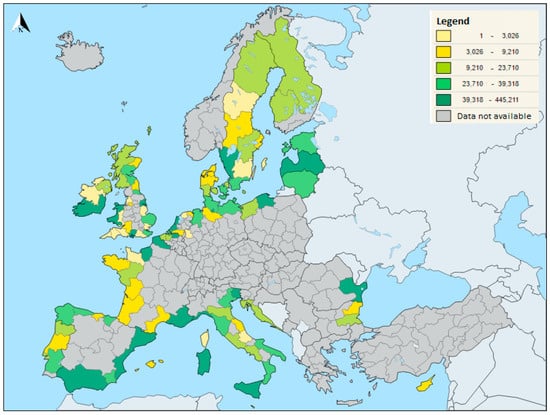 The regions of the European Union included in the research (adapted from European Commission (Eurostat). Maritime transport of freight by NUTS 2 regions—map. 2016. [45] with permission from Eurostat, 2020.).