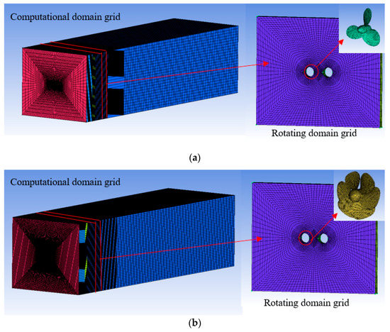 The current investigation used ICEM 15.0 software for grid generation. Lam [15] suggested that the grid for the water subdomain could be meshed by the structure grid for more calculation accuracy. The rotor subdomain is suitable for an unstructured grid. The meshed twin-propeller system and surrounding fluid are shown in Figure 2. The propeller plane is intercepted from the computational domain grid of propeller-76. The mesh generation of rotation domain and propeller rotor is shown in Figure 2a. The mesh division of propeller-131 is shown in Figure 2b.