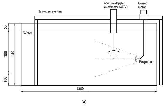 In this study, a model experiment was designed to verify the previous theoretical research and numerical simulations of a propeller jet. A water tank, 1.2 m long, 0.8 m wide, and 0.45 m high, was selected to allow the expansion of twin-propeller jets, as in previous studies [17]. The power train system was designed and fabricated from a motor, a gearbox, and connecting rods to allow the twin propeller to rotate outward and inward at different speeds. Acoustic Doppler velocimetry (ADV) was used for the point measurements. A purpose-built traverse system allowed the ADV to accurately measure the scour depth, as shown in Figure 3. The submergence of the propeller affects the jet structure. It is mainly caused by the adhesive force of the boundary. In the experiment, the diameter of the propeller was 55 mm. The water depth of the flume was 400 mm. Small boundary effects could be observed at a distance from the propeller. However, near the propeller, the boundary effect could be ignored. The test measurement was mainly carried out in the boundless influence area.