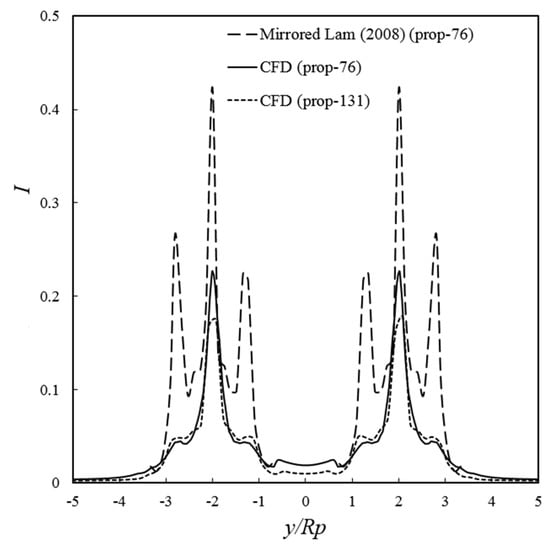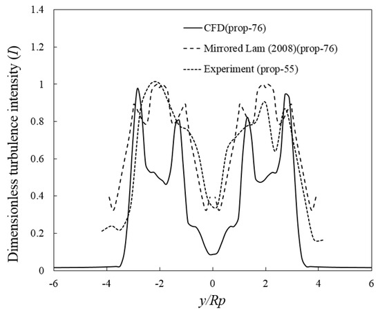 Figure 5 shows the distribution of the dimensionless turbulence intensity at 1 within ZFE-TP-4P. The CFD simulation shows four peaks near the two propeller axes. However, this was not observed in the experimental records or in Lam’s results [15]. The maximum variation was 52%, which occurred at the axis of the left propeller.
