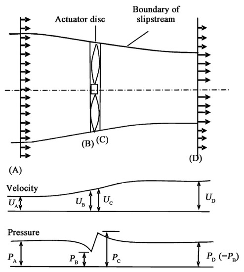 Previous studies originated from the efflux velocity of the propeller. The axial momentum theory provided a theoretical basis for subsequent studies. Inspired by the study of plain water jets by Albertson et al. [1], Stewart [18] proposed that the thrust provided by propellers satisfies Equation (5). The application of the axial momentum theory in the calculation of efflux velocity of a propeller jet is shown in Figure 6. The zone (A) far upstream and zone (D) far downstream are far enough away from the propeller that the fluid pressure (PA) at zone (A) and the fluid pressure (PD) at zone (D) are equal to the hydrostatic pressure. When the fluid flows through the propeller, it accelerates from zone (B) to zone (C) through the propeller. Pressure (PB) increases to (PC). The velocity also increases from to .