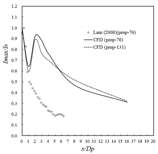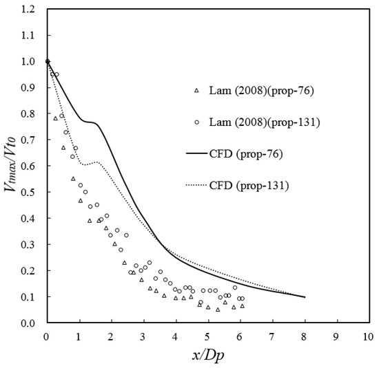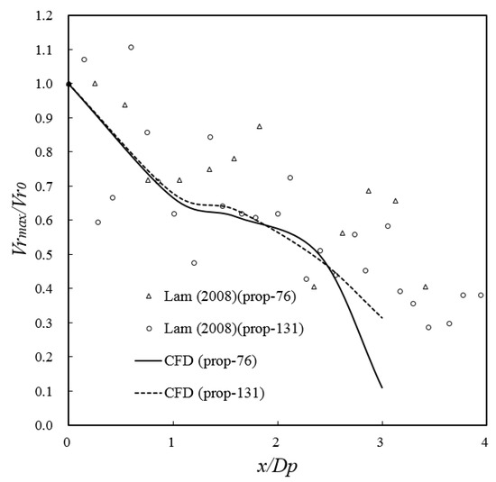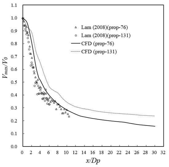 Jiang et al. [12] suggested several equations for predicting the twin-propeller jet-induced axial velocity decay according to the CFD results for the Twin-propeller-76 jet. Stewart [18] proposed that the propeller type does not affect the decay of the maximum axial velocity. However, Hamill et al. [22] refuted Stewart’s idea based on an experiment with four different propellers. Hamill et al. [22] showed that different types of propeller jets decay differently. Figure 8 compares the maximum axial velocity decay of Twin-propeller-76 and Twin-propeller-131. The CFD result for axial velocity decay of a twin propeller was greater than Lam’s experimental result [15] for a single propeller. The maximum axial velocity of Twin-propeller-131 decayed more slowly than that of Twin-propeller-76.