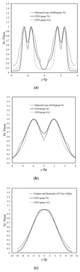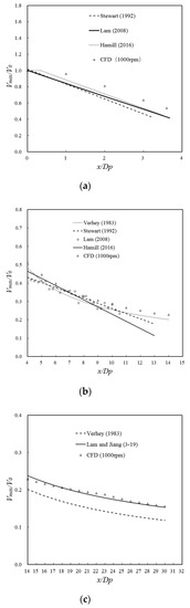 The axial velocity decay in different regions was slightly different with different twin-propeller jet peaks. Jiang et al. [12] proposed that the zone of four peak values is x/Dp = 0 to x/Dp = 3.5. The zone of two peak values is x/Dp = 3.5 to x/Dp = 14. The zone of four peaks is adjacent to the zone of two peaks, forming the zone of flow establishment. After x/Dp = 14, there is only a single peak, known as the zone of established flow. Using Propeller-76 as an example, the CFD results for the axial velocity decay in each zone were compared with previous results, as shown in Figure 9. The axial velocity decay of a twin-propeller jet is expressed in Equation (9). Compared with the single propeller, the axial velocity attenuation rate of twin-propeller was smaller. This may be because there is a completely static fluid around a single-propeller jet. The mixing of the twin propeller pulps can accelerate the wake.