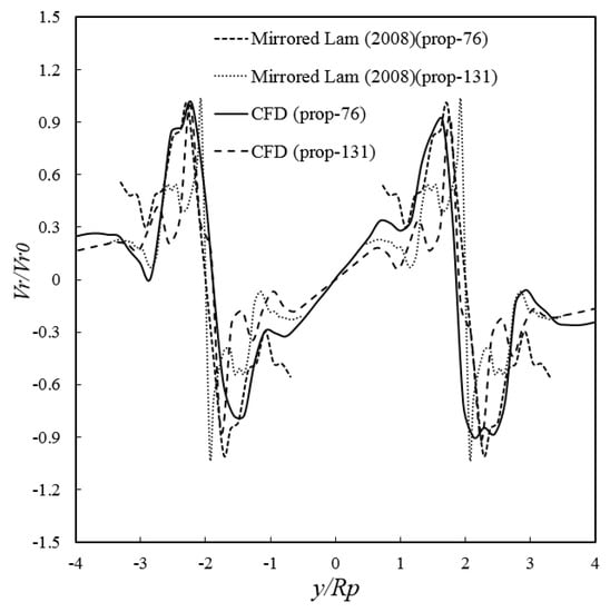 Lam’s experimental results [15] showed that the efflux velocity of Twin-propeller-131 occurred at , which is 2.4% less than the CFD calculation results, while the efflux velocity of Twin-propeller-76 occurred at , which is 19% greater than the CFD calculation results.