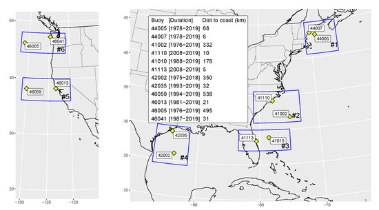 Map of the six regions indicated by blue boxes, and the associated NDBC moored data buoys.