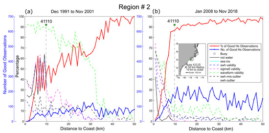 Total number of observations per 1 km bin, and proportion of data associated with good quality and rejection flags, as a function of distance to the coast, for region #2 on the east U.S. coast. The (a) first 10 years and (b) last 10 years of the Sea State CCI L2P satellite record are shown.