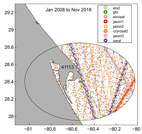 Spatial distribution of satellite tracks contributing to Hs measurements within a 50 km radius of buoy 41113 (region #3).
