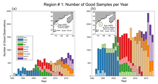 Detailed temporal properties of altimeter sampling is of interest and variability in total annual “Good” Hs measurements by mission is shown for the various buoy locations in regions #1 and #2 in Figure 5 and Figure 6 respectively. The coloured bars that correspond to the different missions that contribute measurements clearly show the missions entering and leaving service. However, there is substantial variability even where the same missions contribute to successive years. In both regions (#1 and #2), there is a clear increase in data at the offshore buoy location largely due to the fact that the sampling radius (50 km) is not partially over the land as is the case for the nearshore location. While this is somewhat obvious, in fact it raises questions about how the ocean surface area, should or could, be geographically sampled and aggregated when focusing on the nearshore. Clearly if a buoy is being used for calibration, then employing a fixed radius around the buoy is somewhat incompatible with the requirement for data being equidistant from the coast. Decisions regarding sample aggregation are likely to be needed on a case-by-case basis, and this is discussed further in Section 4.2. Nonetheless, in this case although the land removes approximately 50% of the sampling area nearshore (Figure 5a), the increase in data seen offshore (Figure 5b) is only partially accounted for by the increase in sampling area. The additional data loss nearshore is explained by the increase in rejected data seen in e.g., Figure 2 with approach to the coast. However, remarkably, in region #6 (Figure S8a), although the nearshore sampling area is partially over land, more observations are available than the corresponding buoy offshore (Figure S8b) for the entire record.