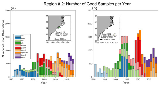 Total number of good (qual_flag = 3) Hs observations per year in region #2, (a) at nearshore buoy 41110 and (b) offshore buoy 41002 based upon a 50 km sampling radius around each buoy.