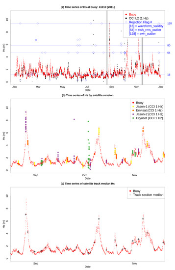 A comparison of a short time series from a buoy and the Sea State CCI L2P product is shown in Figure 7. The series of hourly measurements of Hs acquired at buoy 41010 during 2011 (red points, all panels) is overlaid by 1 Hz measurements acquired from all satellite missions observing a region of radius 50 km around the buoy location. The choice of this buoy as an example is somewhat arbitrary although in part is due to the passage of high intensity storms, including two major hurricanes (Irene and Ophelia), making it a useful example in the context of extremes. A total of four different missions were flying concurrently during this particular period and how they each contributed to this data can be seen in Figure 7b.