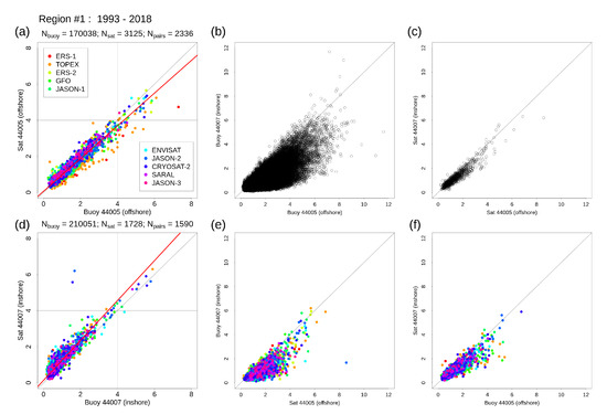 Scatter plots showing pairwise 1-h observations in region #1, at 44005 (offshore) and 44007 (nearshore) for combinations of source data and locations. (a,d) show Sea State CCI L2P vs. buoys 44005 and 44007 respectively. Red lines (a,b) show the fit of linear major-axis regression models to the entire data set. (b,c,e,f) show comparisons of the remaining combinations of source data and location. Colouring by mission is applied to selected panels where this makes sense.