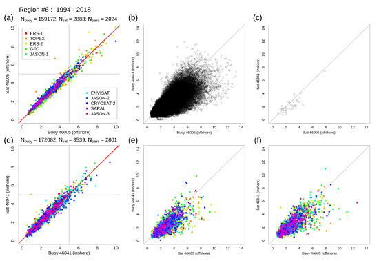 Scatter plots for pairwise 1-h observations in region #6, at 46005 (offshore) and 46041 (nearshore) for combinations of source data and locations. (a,d) show Sea State CCI L2P vs. buoys 46005 and 46041 respectively. Red lines (a,b) show the fit of linear major-axis regression models to the entire data set. (b,c,e,f) show comparisons of the remaining combinations of source data and location. Colouring by mission is applied to selected panels where this makes sense.