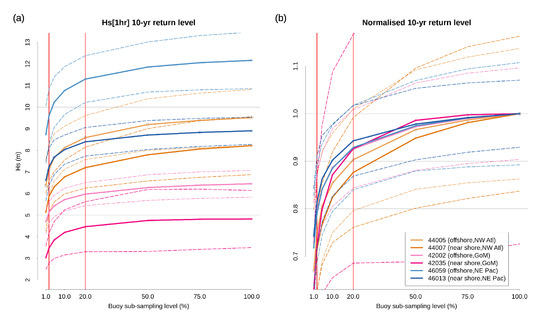 Figure 10 shows the Hs 10-year return level estimated at sampling levels between 1% and 100%. Figure 10a shows the estimates of absolute values of Hs, and it can be seen how these estimates are reduced as the level of sampling drops. Initially the decrease is fairly linear but below approximately 50% sampling the rate decreases nonlinearly and fairly substantial bias is introduced. Since this is a general approximation to the sampling rates seen in the Sea State CCI L2P product in any given geographic location, typically <2%, it is reasonable to expect that 10-year return level estimates would typically be severely underestimated. In Figure 10a,b, for reference, red vertical lines are marked at 2.5% and 20%. Figure 10b provides further insight. The curves (and uncertainty bounds) have been scaled by their 10-year return levels such that the common scale shows the difference in relative response to increased sampling. Some locations (such as NE Pacific) appear to be somewhat less affected by under-sampling than others (such as NW Atlantic). However, improvement in estimate due to increased sampling is not consistent across sites. Inspection of the uncertainty bounds reveals that once sampling is ∼20% of the total, the upper bound tends to exceed the “true” value. The red vertical line at 20% intersects a number of the upper bound (dashed) lines. An exception to this are the very wide confidence bounds for buoy 42035 in the Gulf of Mexico. While a detailed examination of this particular difference could be time consuming, we speculate that the impact of infrequent but powerful hurricanes is an important cause of this uncertainty. Infrequent high magnitude events, in a predominantly low magnitude climate, tend to substantially increase the uncertainty in fitting extreme value models due to very “long tails” in the probability distribution (see e.g., [27]). Regardless, these results suggest that under-estimation of 10-year return levels could be substantial where sampling remains below the 50% to 75% range.