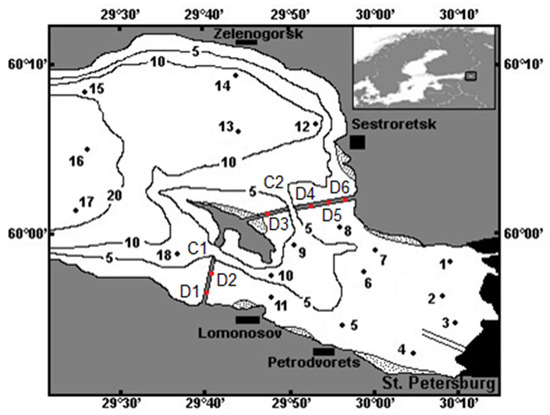 The Neva Estuary with an indication of the sampling stations. Black lines show 5, 10, and 20 m isobaths. Areas with dots indicate dense reeds. C1, C2—gates for vessels; D1–D6—waters gates in the St. Petersburg Flood Protection Facility.