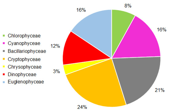 Cryptophyceae accounted for the bulk (24%) and Bacillariophyceae played a significant role in the total biomass of phytoplankton (Figure 2). These two groups together accounted for 45% of the phytoplankton biomass. Cyanophyceae and Euglenophyceae were next in biomass, and Chrysophyceae had the lowest biomass (Figure 2).