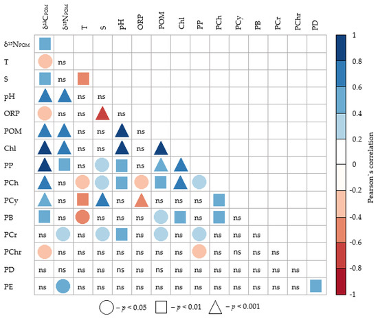 In general, δ15NPOM and δ13CPOM values were positively significantly correlated with each other (Figure 4). However, the δ15NPOM values correlated somewhat differently with the other studied variables. Of the environmental variables studied, δ15NPOM values most closely correlated with pH. This isotope ratio also showed a significant positive relationship with biotic environmental factors, but the relationship was weaker compared to δ13CPOM. At the same time, in contrast to δ13CPOM, the δ15NPOM values did not show any relationships with water temperature, salinity, and ORP values (Figure 3).